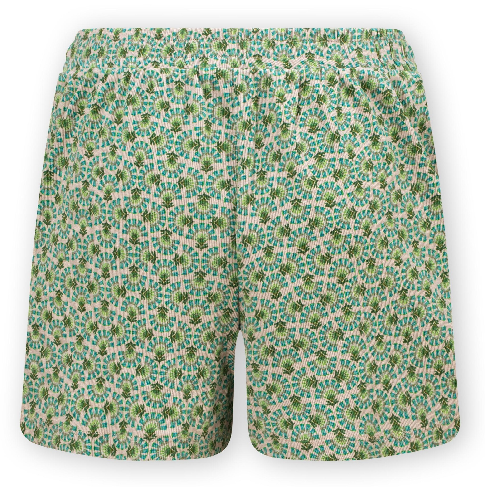 Deze Verano Shorts uit onze Spring Summer loungewear collectie is heerlijk luchtig en speels. Gedecoreerd met het organische Verano dessin in groen. De print bestaat uit een variatie van halve circels met een speels kleurverschil. Deze short is gemaakt van een 2x2 rib stof van katoen, waardoor de short stretchy is en een hoog draagcomfort heeft. Het broekje heeft een elastische taille voor extra comfort en een nepgulp met knoopjes voor een speels boyfriend detail. Deze Verano shorts is heerlijk luchtig, waardoor het ideaal is voor naar het strand of park of voor thuis.