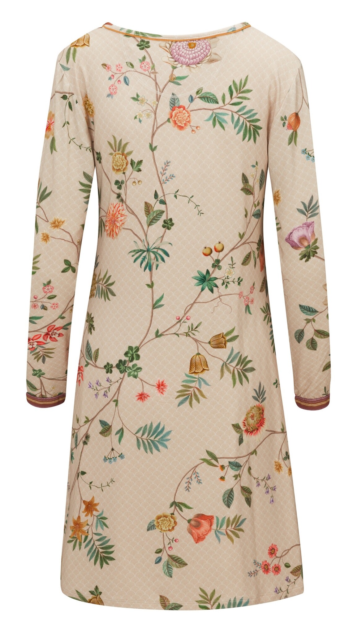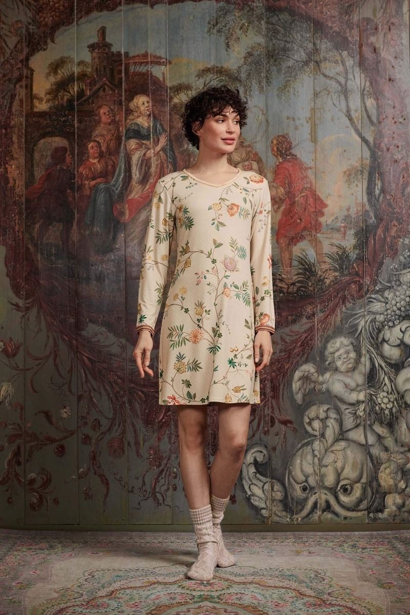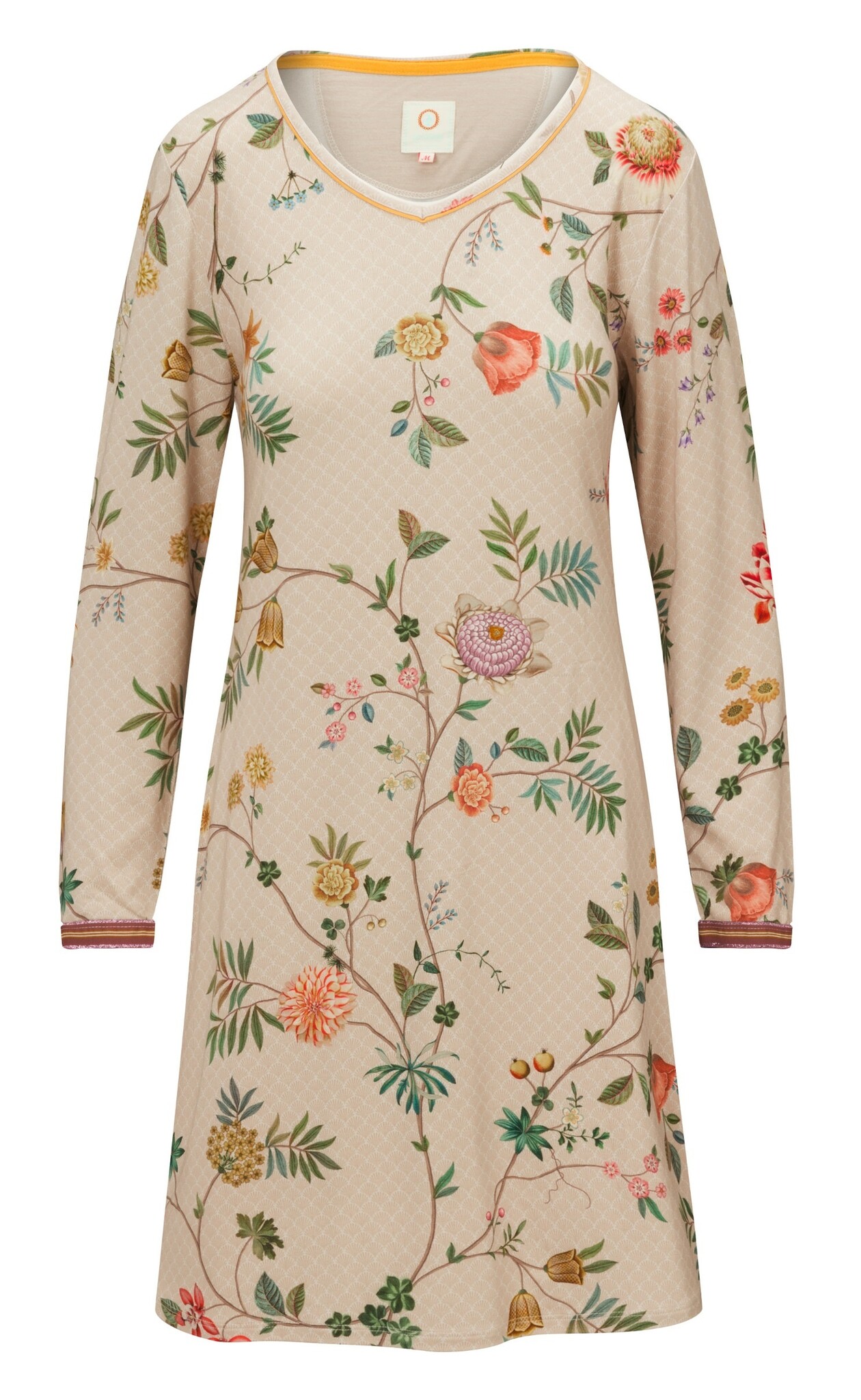 Dit nachthemd in zand is versierd met het vrolijke La Dolce Vita dessin. Het herhaalde bloemendessin bestaat uit verschillende bloesemtakken en verschillende soorten fantasiebloemen in rood en geel. De mouwen zijn afgewerkt met een gedetailleerde bies.