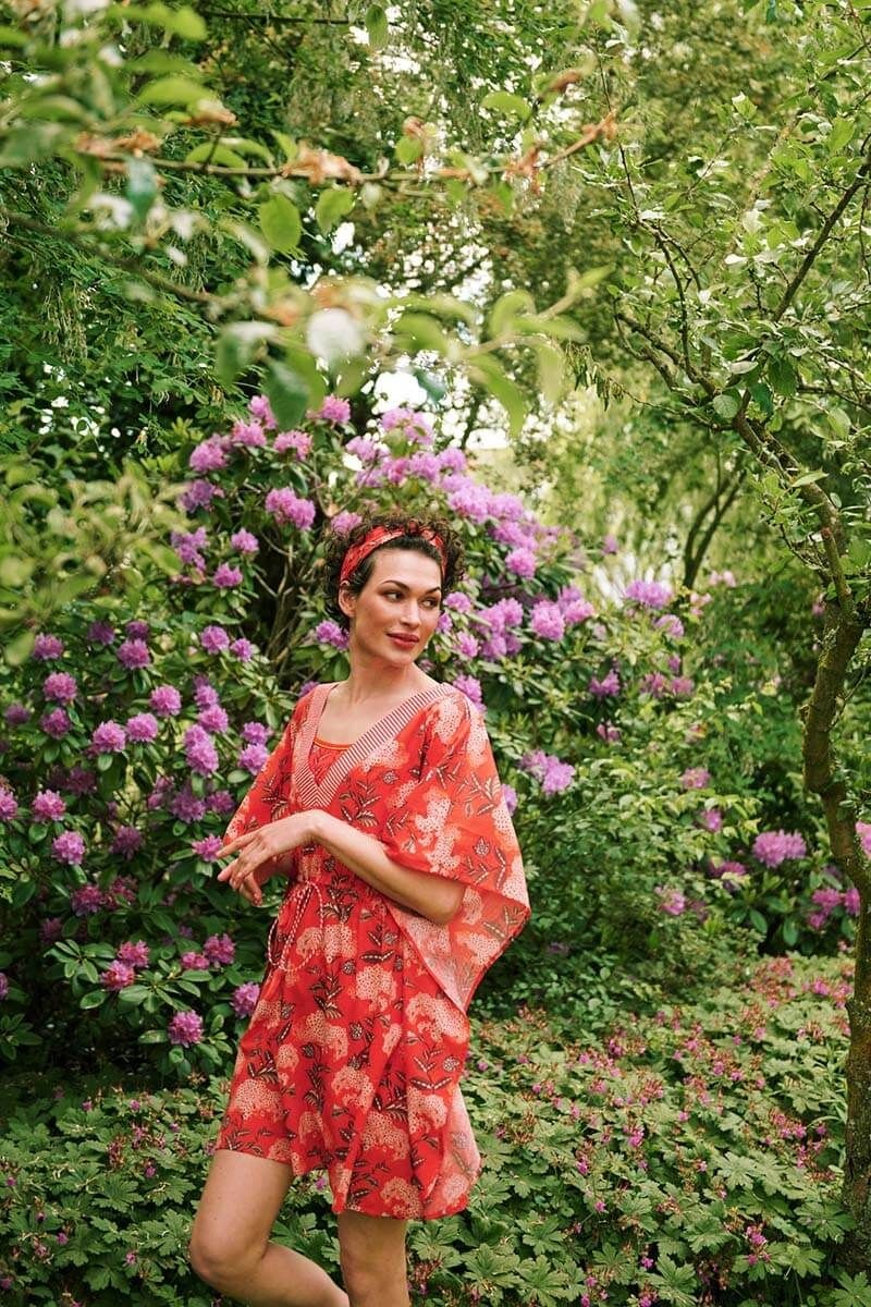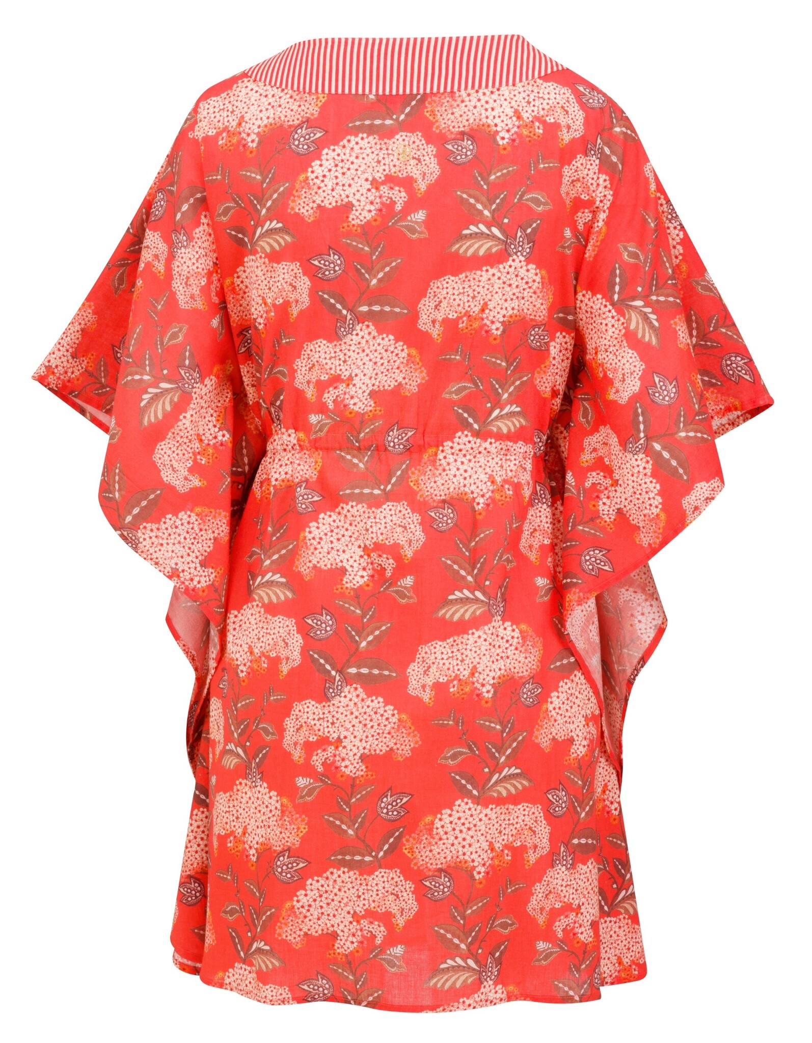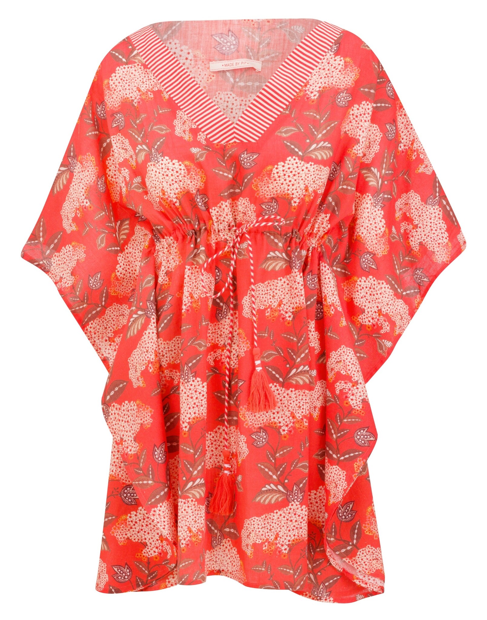 Een korte strandkaftan bedrukt in een levendige bloemenprint Flora Firenze, gemaakt van zachte katoenen voile. De koraalroze tuniek heeft een trekkoord en een V-hals, welke afgewerkt is met het Little Sumo Stripe. Perfect voor vakanties met warm weer of als strand cover-up op zonnige stranddagen.