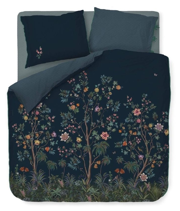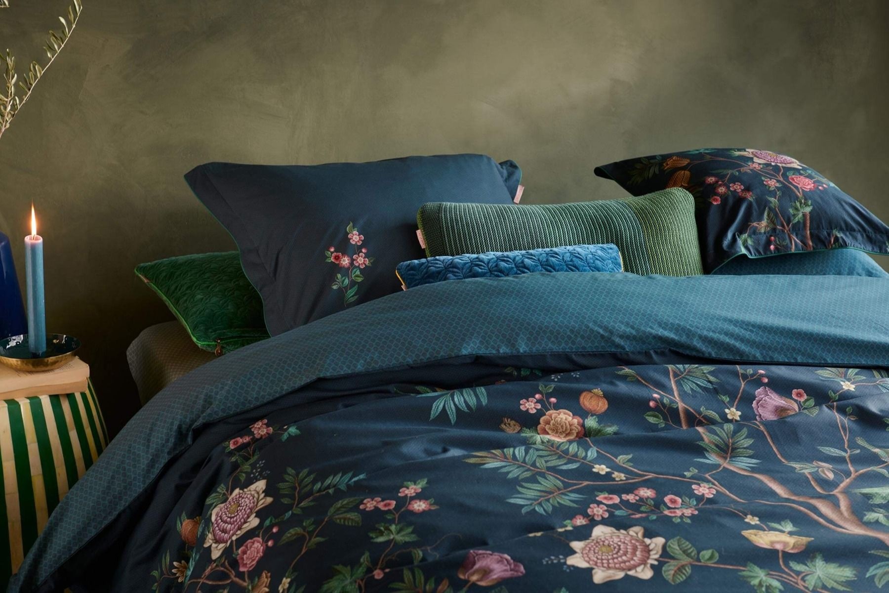 De kussenslopen en het dekbedovertrek hebben een doorgestikte oxford rand aan de zijkanten en zijn afgewerkt met een ronde bies, daarnaast hebben de kussenslopen een unieke striksluiting dit alles geeft het dekbedovertrek en de kussenslopen een extra rijke en luxe uitstraling. De achterkant van het dekbedovertrek en de kussenslopen hebben een print van blaadjes, waardoor het dubbelzijdig gebruikt kan worden. Dit geeft een speels mix&match-effect op je bed.