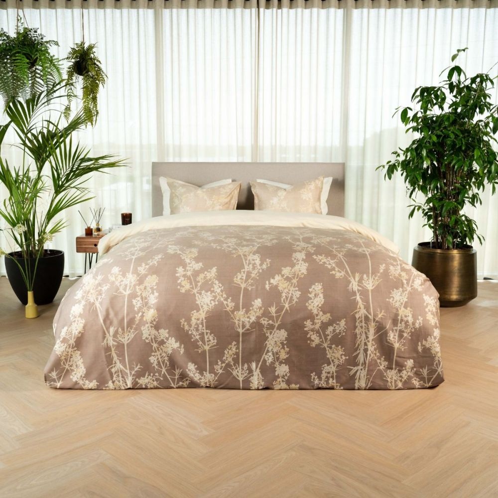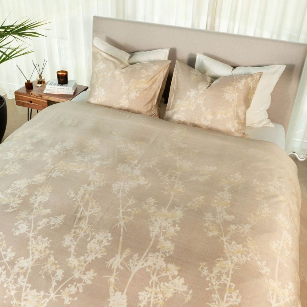 Ontdek Mido, een dekbedovertrek dat rust, elegantie en natuur met elkaar verbindt. Het ontwerp bestaat uit een uitgestrekte bloemenprint in prachtige zachte, ton-sur-ton tinten. De subtiele colorfade, van licht naar iets dieper beige, geeft het overtrek een mooie diepte. Het resultaat is een  dromerige uitstraling die elke slaapkamer direct een serene sfeer geeft.