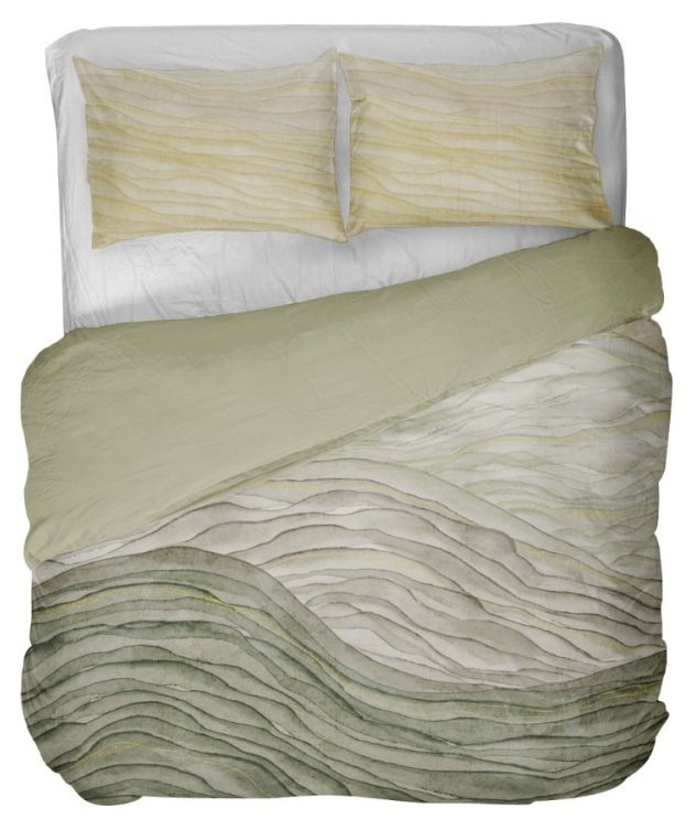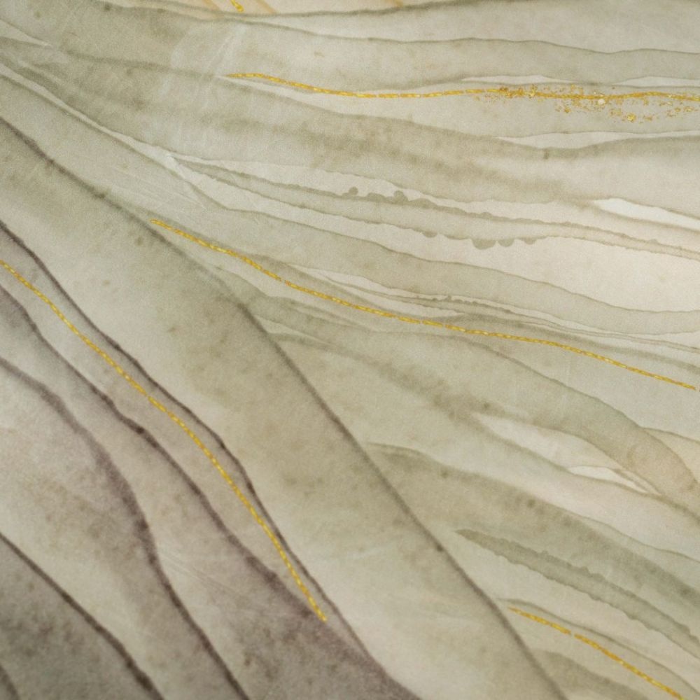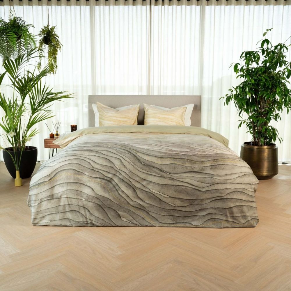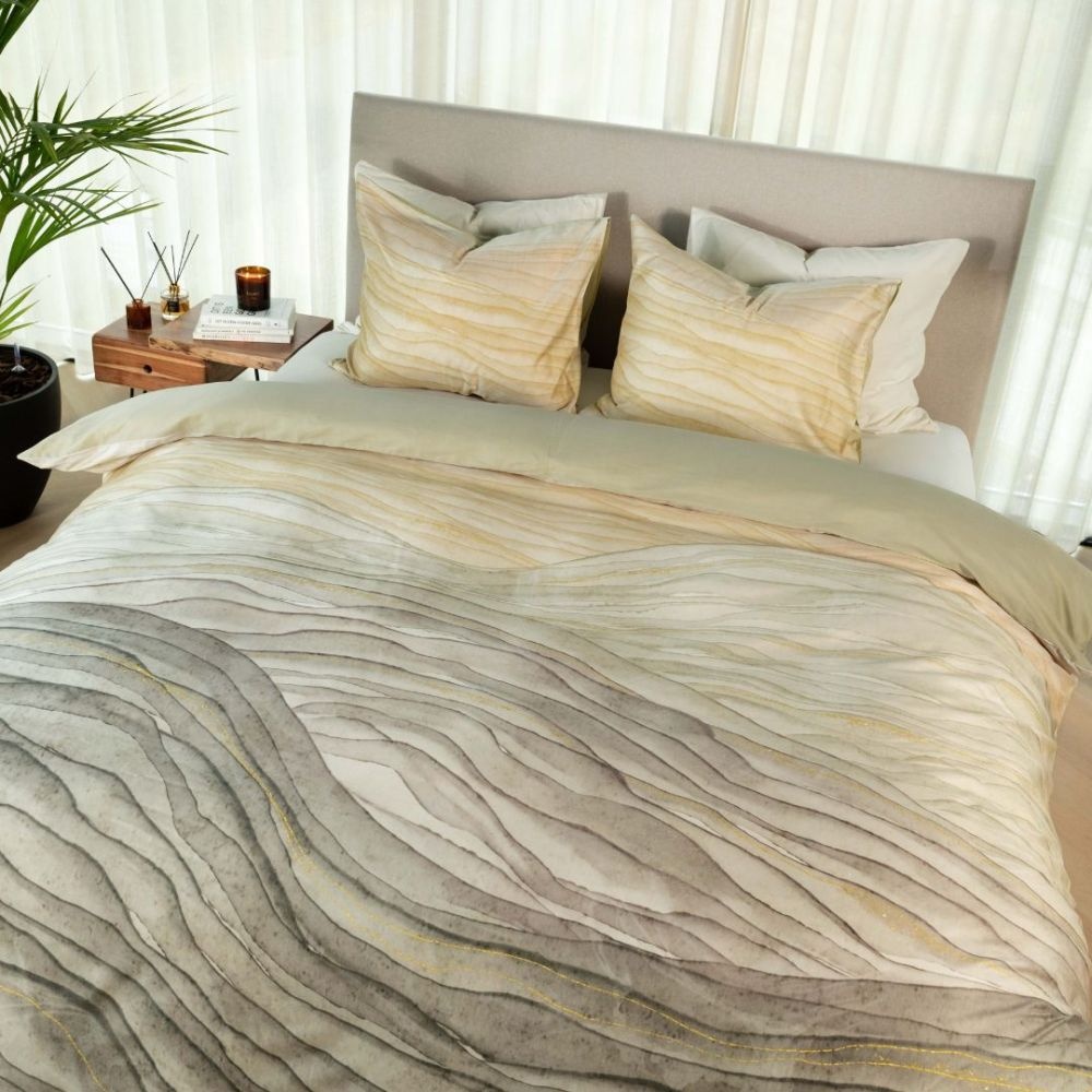 Zaki geeft je een gevoel van rust en natuur in je slaapkamer. Het dessin doet je denken aan een berglandschap, zachte vloeiende lagen. Het is afgewerkt met verfijnde gouden lijntjes die extra luxe toevoegen aan dit overtrek. De achterzijde heeft een rustige effen kleur, een vergrijsde olijgroene tint die perfect aansluit op het palet van het dessin.