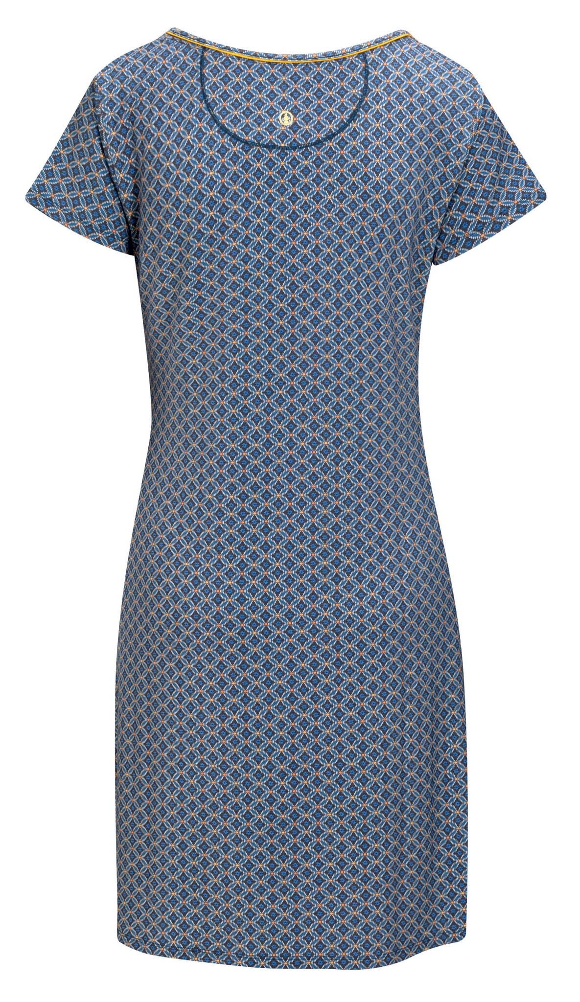 Dit nachthemd in het blauw is uitgevoerd met het organische Tegola dessin. De print bestaat uit een variatie van circels met een speels kleurverschil. Het nachthemd heeft korte mouwen.