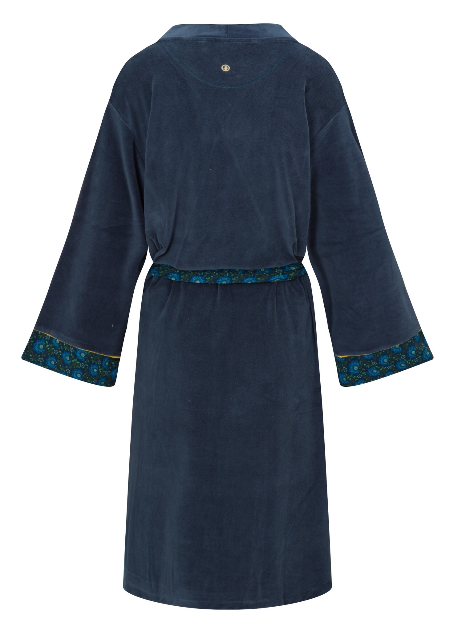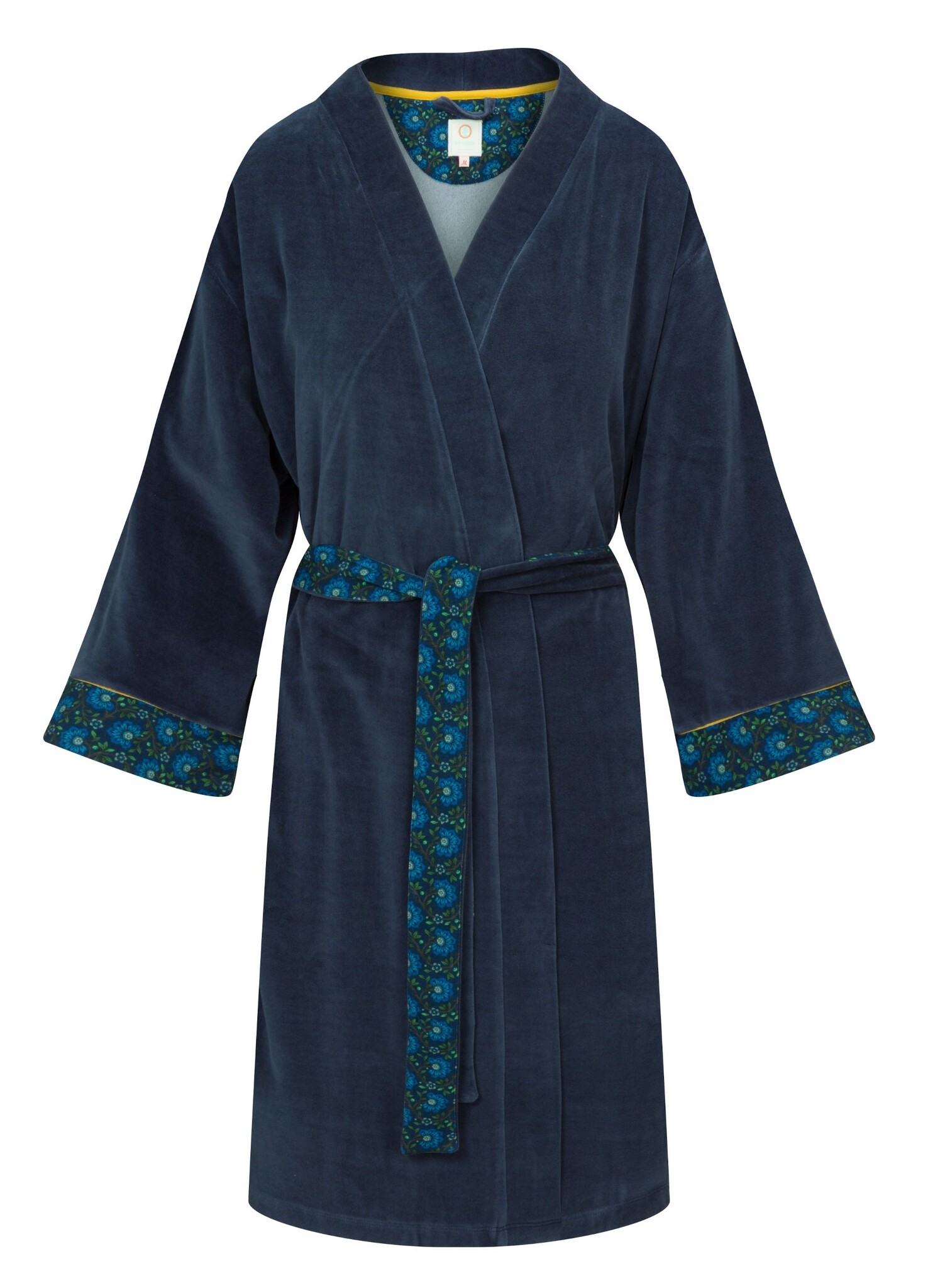 Deze donkerblauwe kimono is versierd met Nicky Velvet. De kimono is gemaakt van fluweel en de mouwen zijn afgewerkt met het Ciao Bella dessin. De kimono heeft een bijpassende ceintuur.