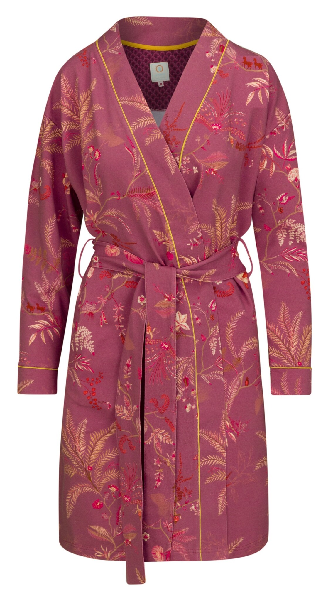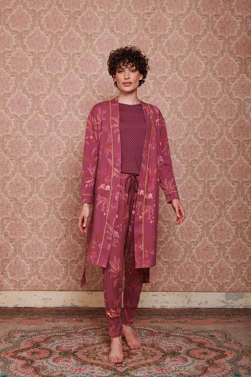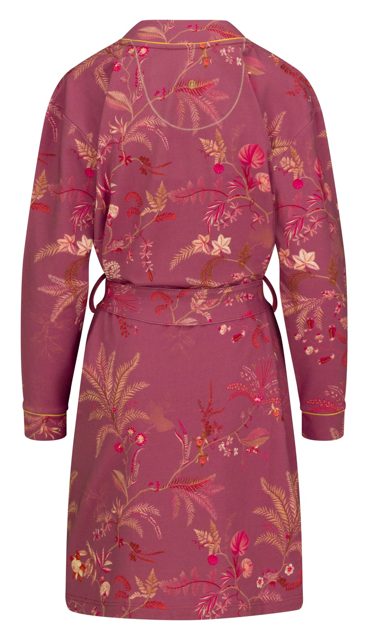 Deze kimono in de kleur roze is uitgevoerd met het speelse Isola dessin. Het speelse dessin heeft een verfijnde print van meerkleurige takjes en varens. De kleuren van het nachthemd zijn zacht met subtiele kleuraccenten. De kimono bevat een bijpassend ceintuur.