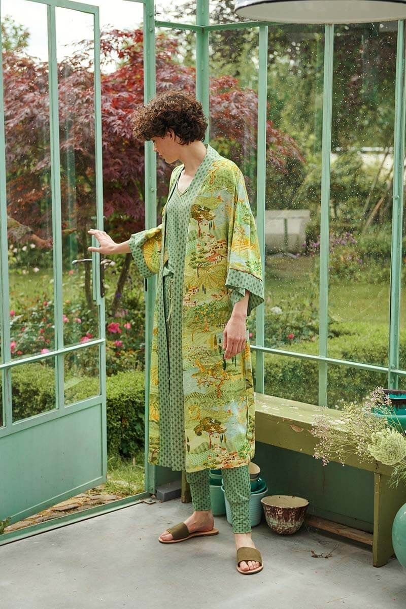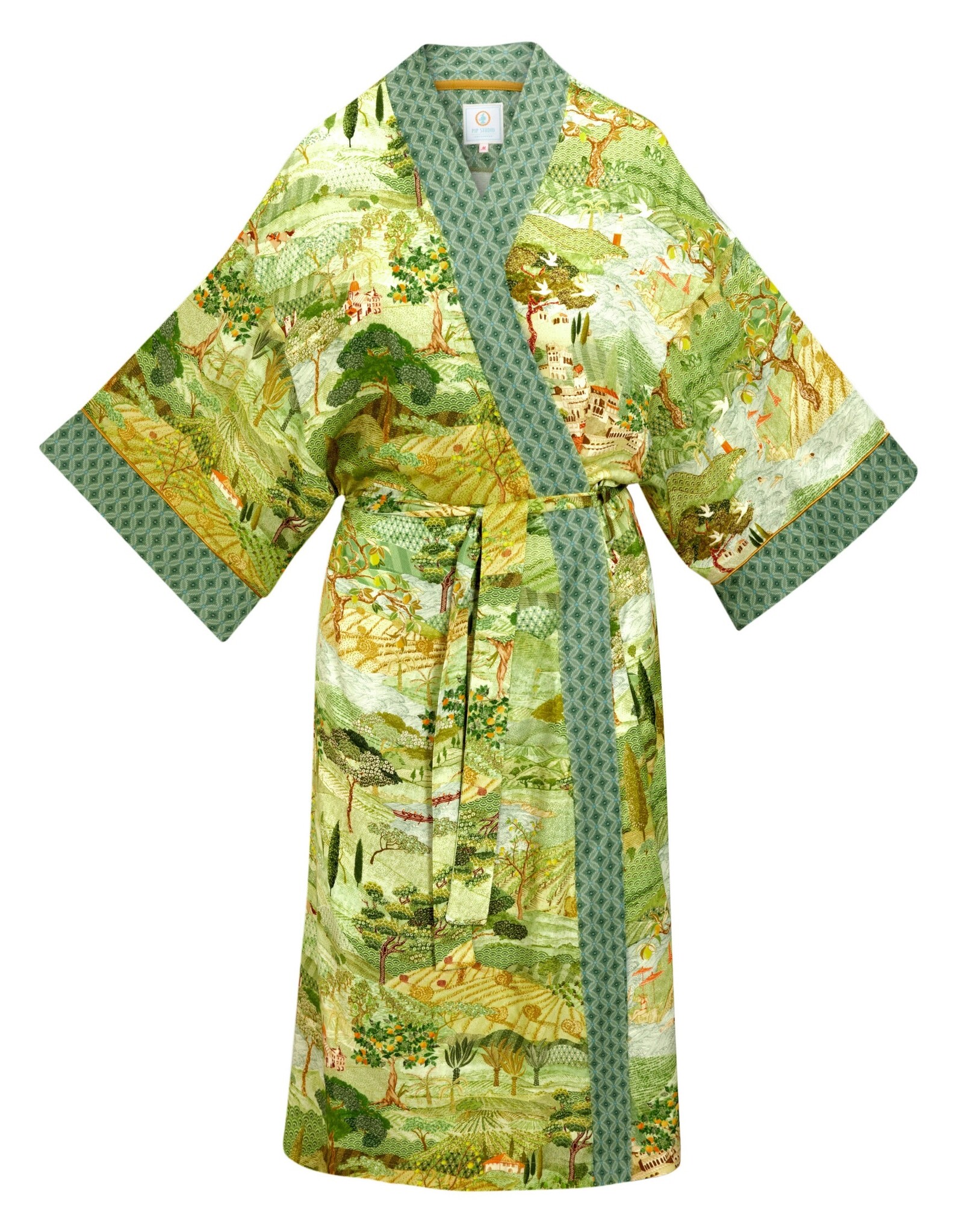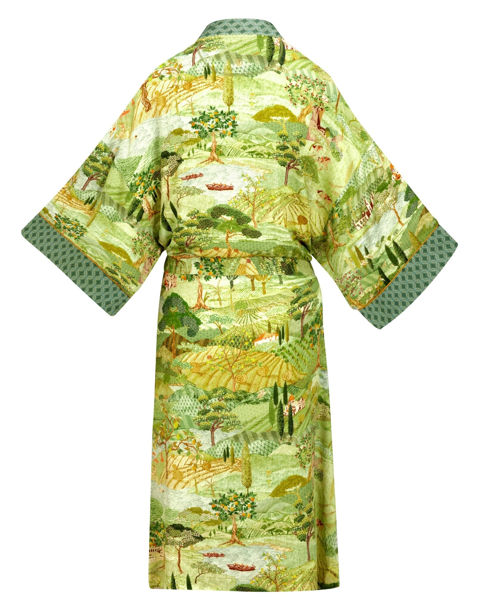 Deze kimono in de kleur groen is uitgevoerd met het prachtige Toscana dessin. De cipressen en subtiele verwijzingen in de print naar de Toscaanse cultuur geven je het gevoel midden in het Italiaanse landschap te zijn. Gemaakt van viscose, waardoor de kimono het lichaam heerlijk flatteerd. De kimono bevat een bijpassend ceintuur. De biesjes van de kimono zijn bedrukt met de herhaalde print Tegola, wat bestaat uit een variatie van circels met een speels kleurverschil.