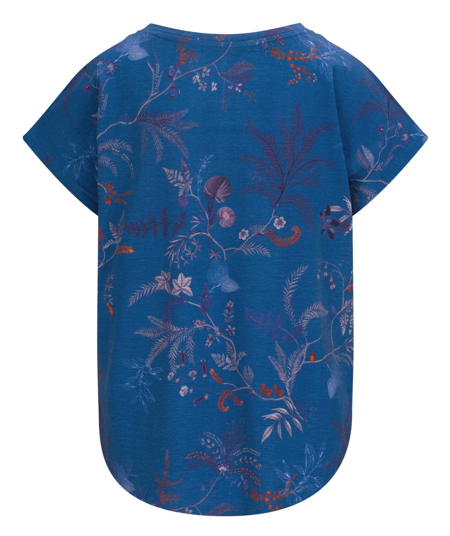 Deze sport top in de kleur blauw is uitgevoerd met het speelse Isola dessin. De print is opgebouwd uit een verfijnde print van meerkleurige takjes en varens. De top heeft een ronde hals en een wijde pasvorm.