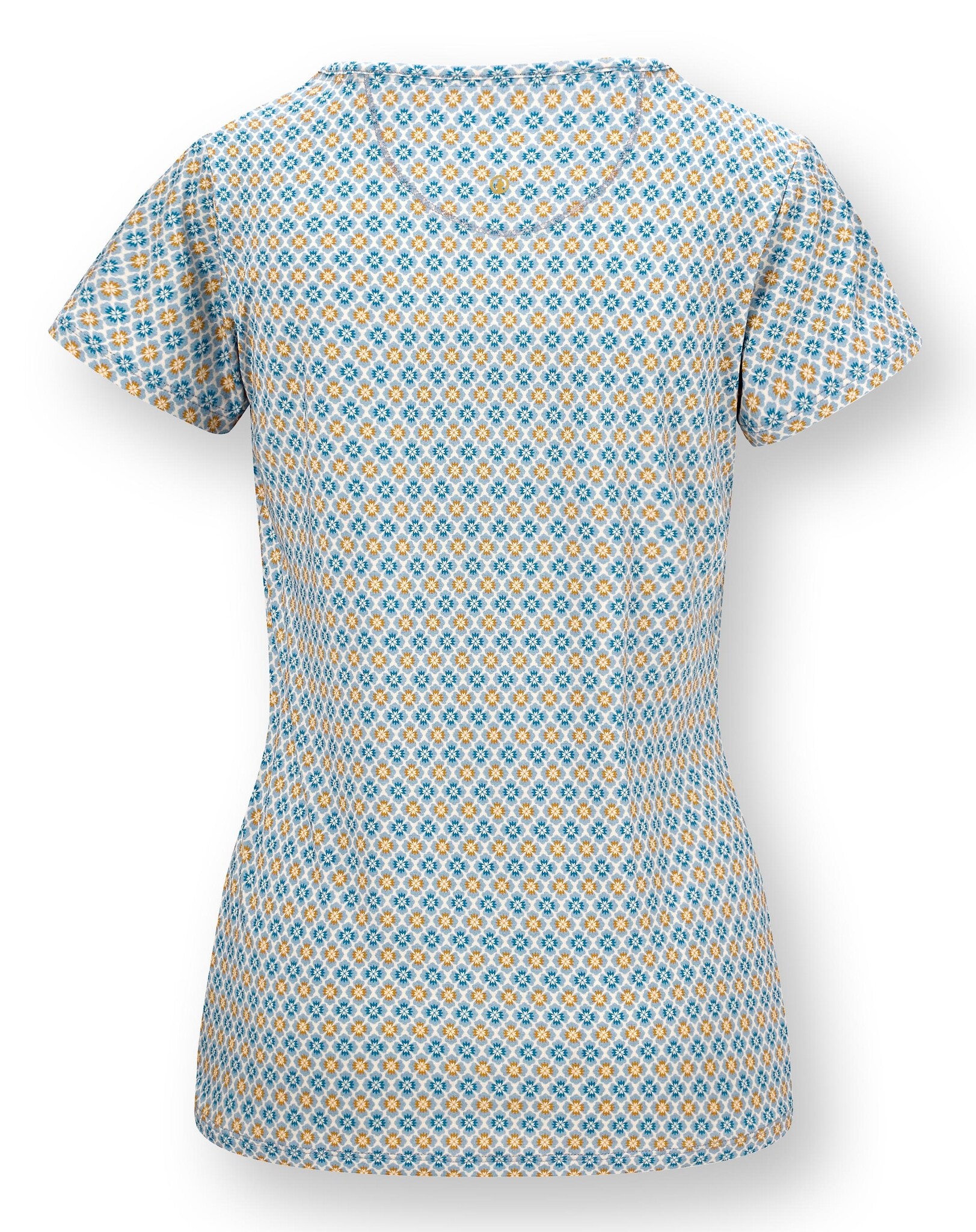 Ga je voor een casual maar modieuze uitstraling? Dan is deze comfortabele Tilly Top Korte Mouw het perfecte basis item om laagjes mee te creëren. Gemaakt van viscose en elastaan waardoor de top heerlijk zacht en stretchy is. De top heeft een ronde hals en korte mouwen, perfect om verschillende casuel stijlen mee te creëren. Het Mojo dessin bestaat uit een klein herhaald bloemetjes print.