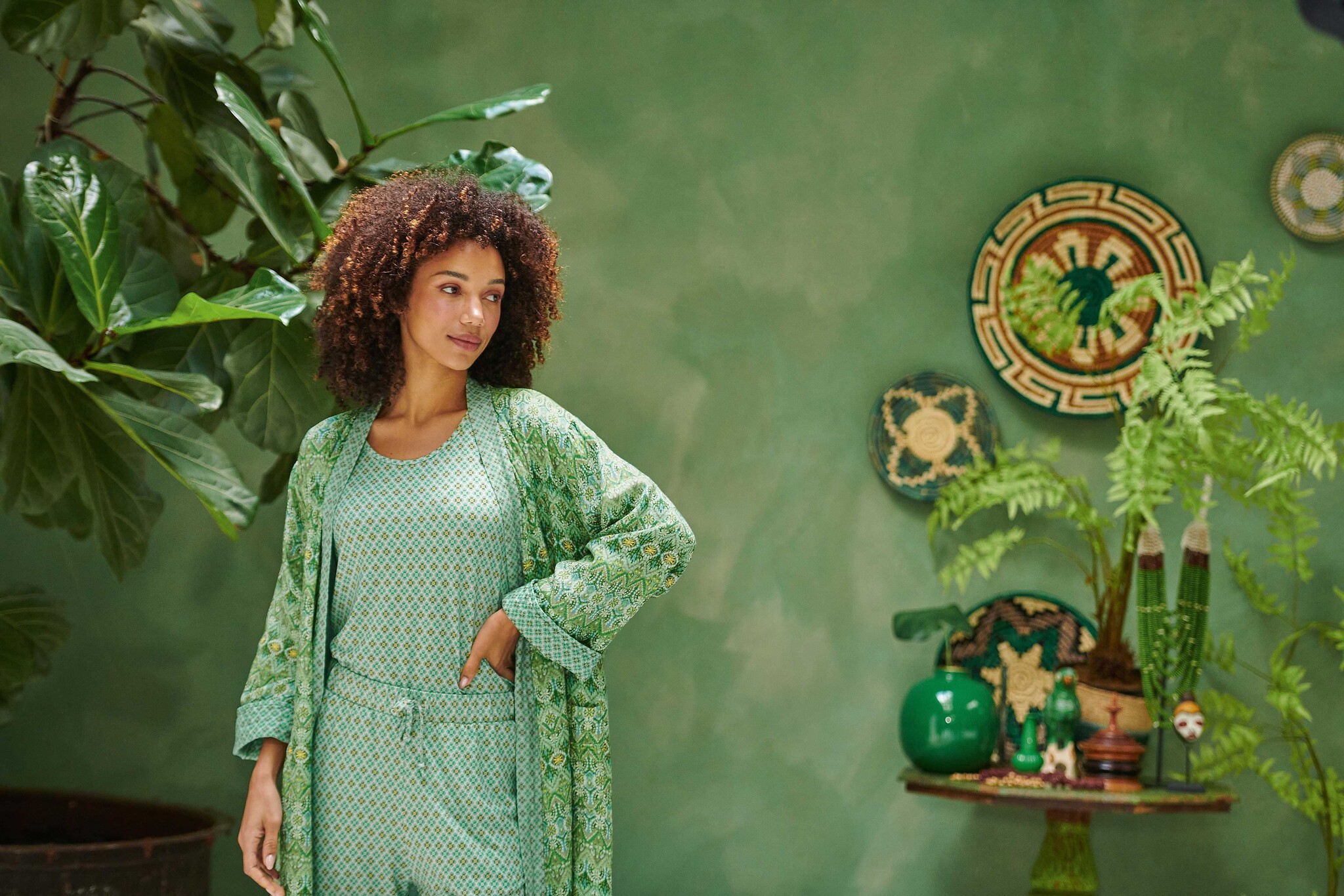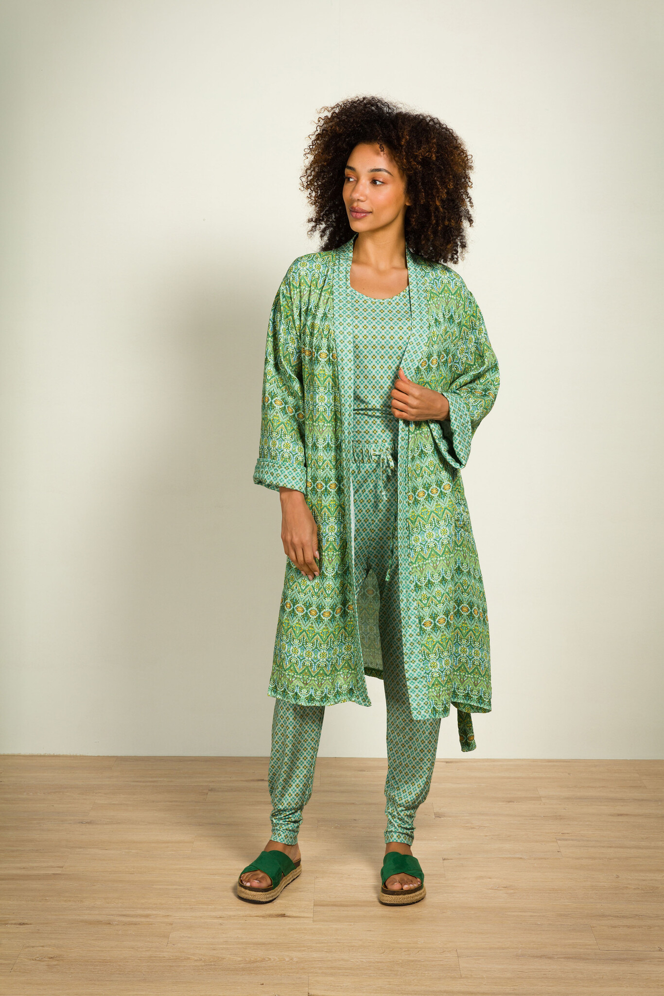 Ons model met bruin haar is 172cm en draagt maat M.