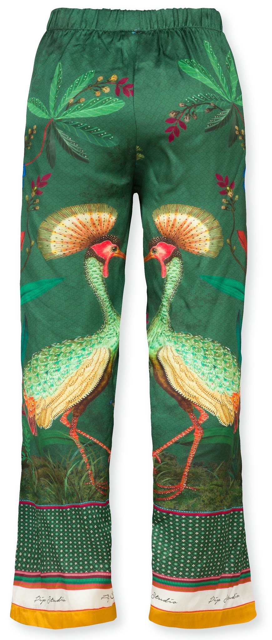 Geef je garderobe een trendy en kleurrijke twist met deze Belin Birds In Love broek. De groene vogels welke groots op de broek zijn gedecoreerd geven je een luxe gevoel en zullen je op slag verliefd maken. Het dessin is opgebouwd uit twee kraanvogels waar sierlijke takken omheen groeien. De onderkant van de broek loopt ietwat uit en is gedecoreerd met een decoratieve rand in diepe kleuren en eindigt met een goudkleurige streep. Tussen de sierlijk geplaatste bloemen zul je hier en daar een prachtige palmboom terugvinden. De taille is elastisch en heeft een koord rondom voor ultiem comfort. Mix & match deze lange broek met de vrolijke prints en comfortabele items uit onze nieuwste homewear collectie en creëer een prachtige combinatie.